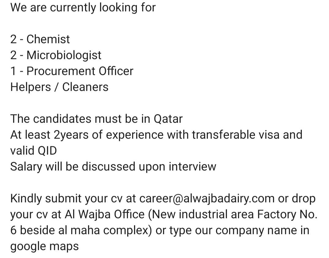 Job Abroad | Chemist | microbiologist | procurement | Helpers | Qutar December 30, 2020 by Food Tech Professionals Job Abroad | Chemist | microbiologist | procurement | Helpers | Qutar Apply on career@alwajbadairy.com
