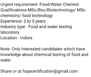 Vacancy for Chemist October 9, 2020 by Food Tech Professionals Vacancy for Chemist fsqacertification@gmail.com
