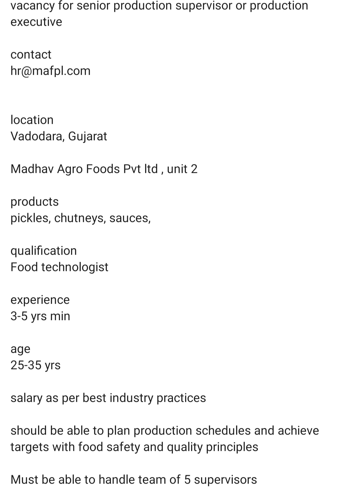 Vacancy for Production Executive | Sr Production Supervisor December 28, 2020 by Food Tech Professionals Vacancy for Production Executive | Sr Production Supervisor Apply on hr@mafpl.com