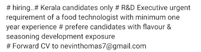 Vacancy for R & D Executive | Urgent | Kerala December 28, 2020 by Food Tech Professionals Vacancy for R & D Executive | Urgent | Kerala Apply on nevinthomas7@gmail.com
